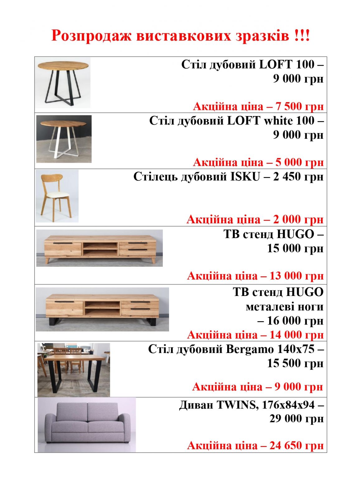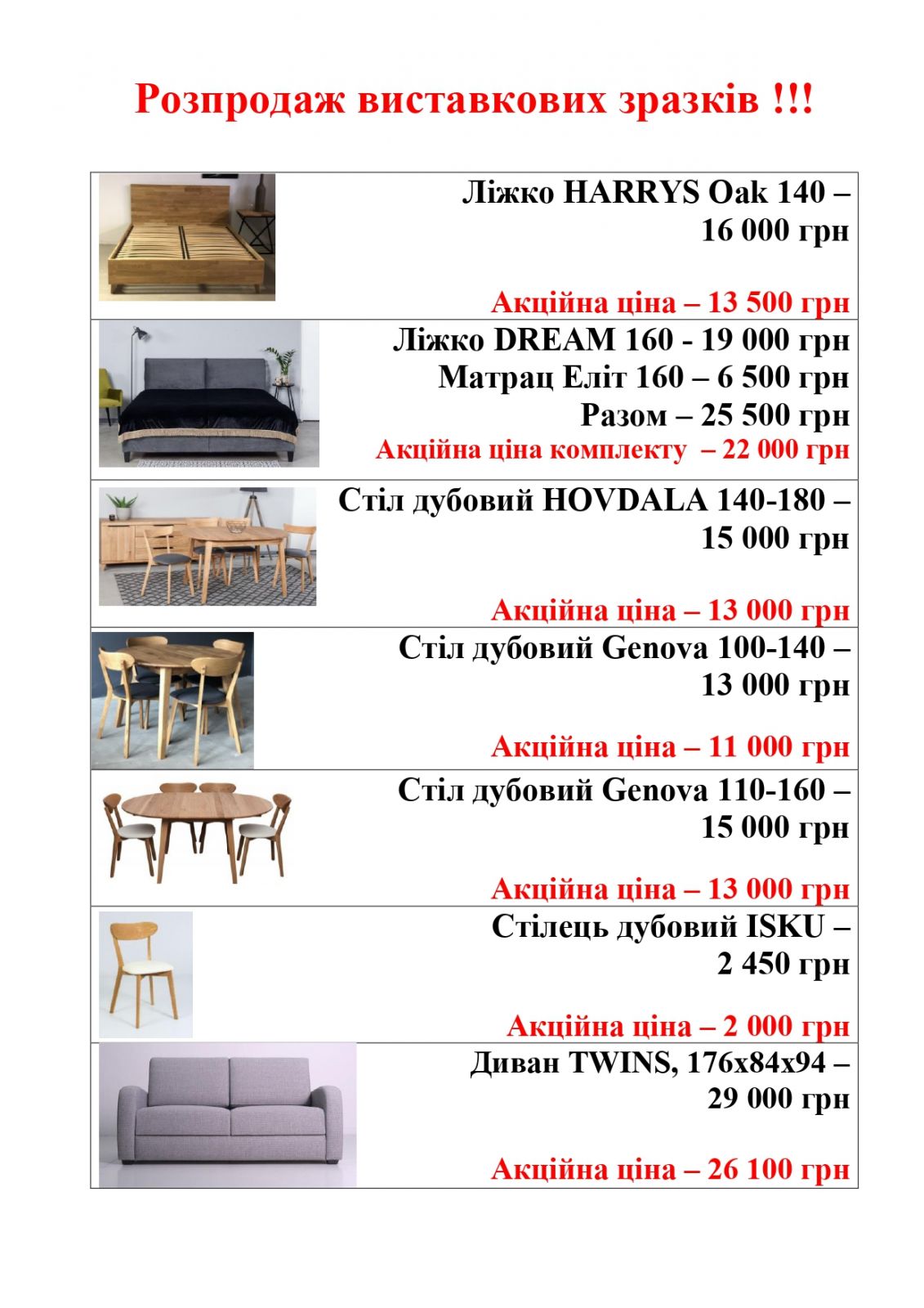 «Знижка -30% на шафи, ліжка та столи, -20% на всі інші меблі та крісла»