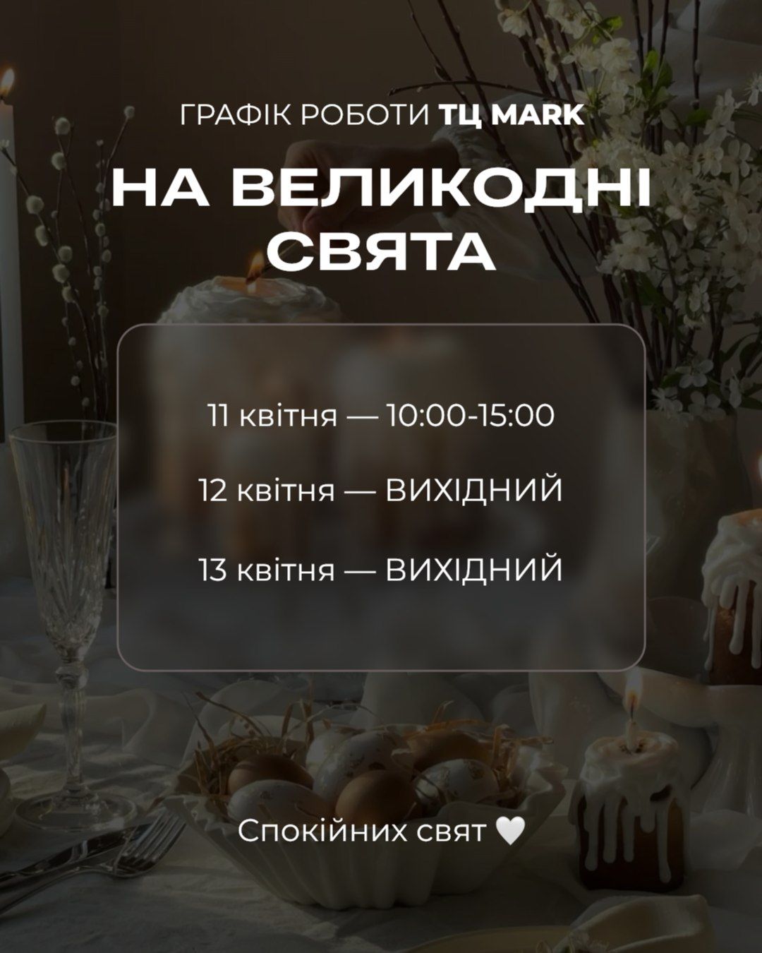 Повідомляємо, що в період Великодніх свят графік роботи ТЦ «MARK» змінюється: