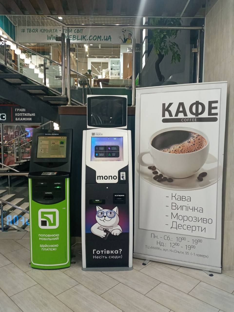 На першому поверсі ТЦ MARK у розташовані термінали самообслуговування Privat24 та A-Bank. Створюйте перекази на картку, поповнюйте мобільний рахунок та будьте завжди на зв'язку з вашими близькими!